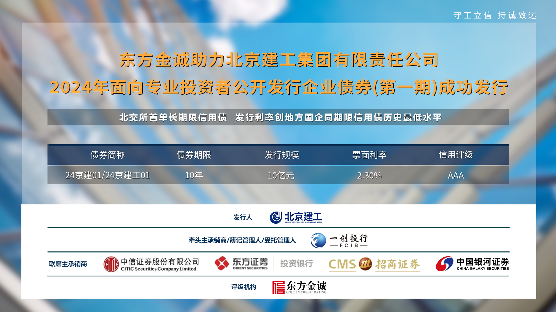 近日,由东方金诚评级的“北京建工集团有限责任公司2024年面向专业投资者公开发行企业债券(第一期)”(以下简称“本期债券”)在北交所和银行间债券市场成功发行。本期债券为北交所首单长期限信用债,发行总规模10亿元,发行期限10年,发行利率2.30%,创地方国企同期限信用债发行利率历史最低水平。