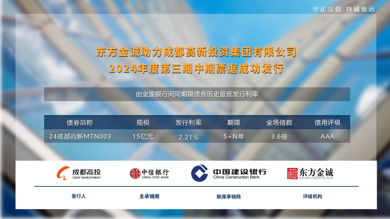 近日,由东方金诚评级的“成都高新投资集团有限公司2024年度第三期中期票据”(以下简称“本期票据”)在银行间债券市场成功发行。本期票据发行总规模15亿元,发行期限5+N年,发行利率2.21%,创全国银行间同期限债券发行利率历史最低。