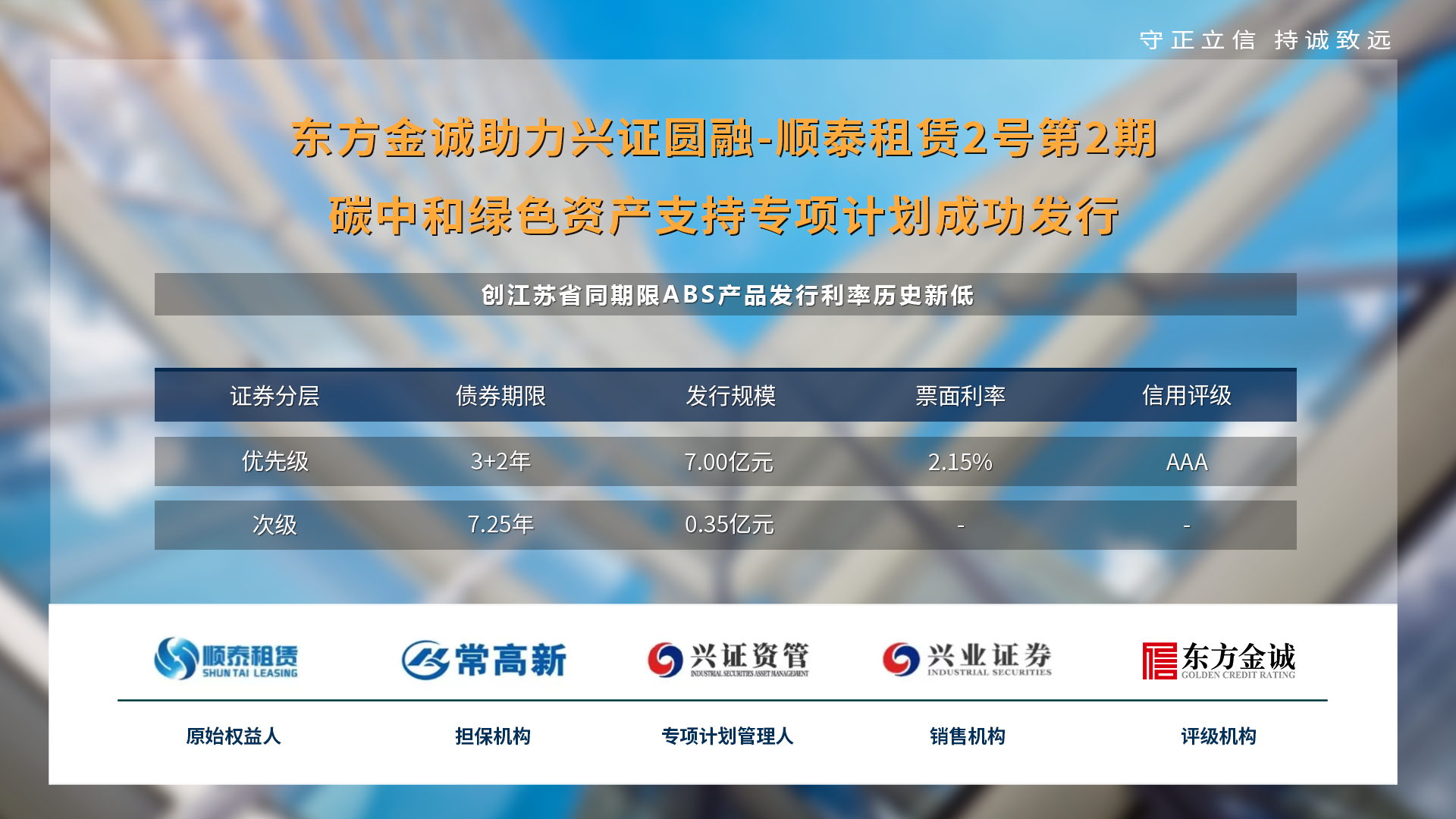近日,由东方金诚评级的“兴证圆融-顺泰租赁2号第2期碳中和绿色资产支持专项计划成功发行”(以下简称“本次专项计划”)在上交所成功发行。本次发行总规模7.35亿元,其中优先级发行规模7.00亿元,发行期限5年,发行利率2.15%,创江苏省同期限ABS产品发行利率历史新低。