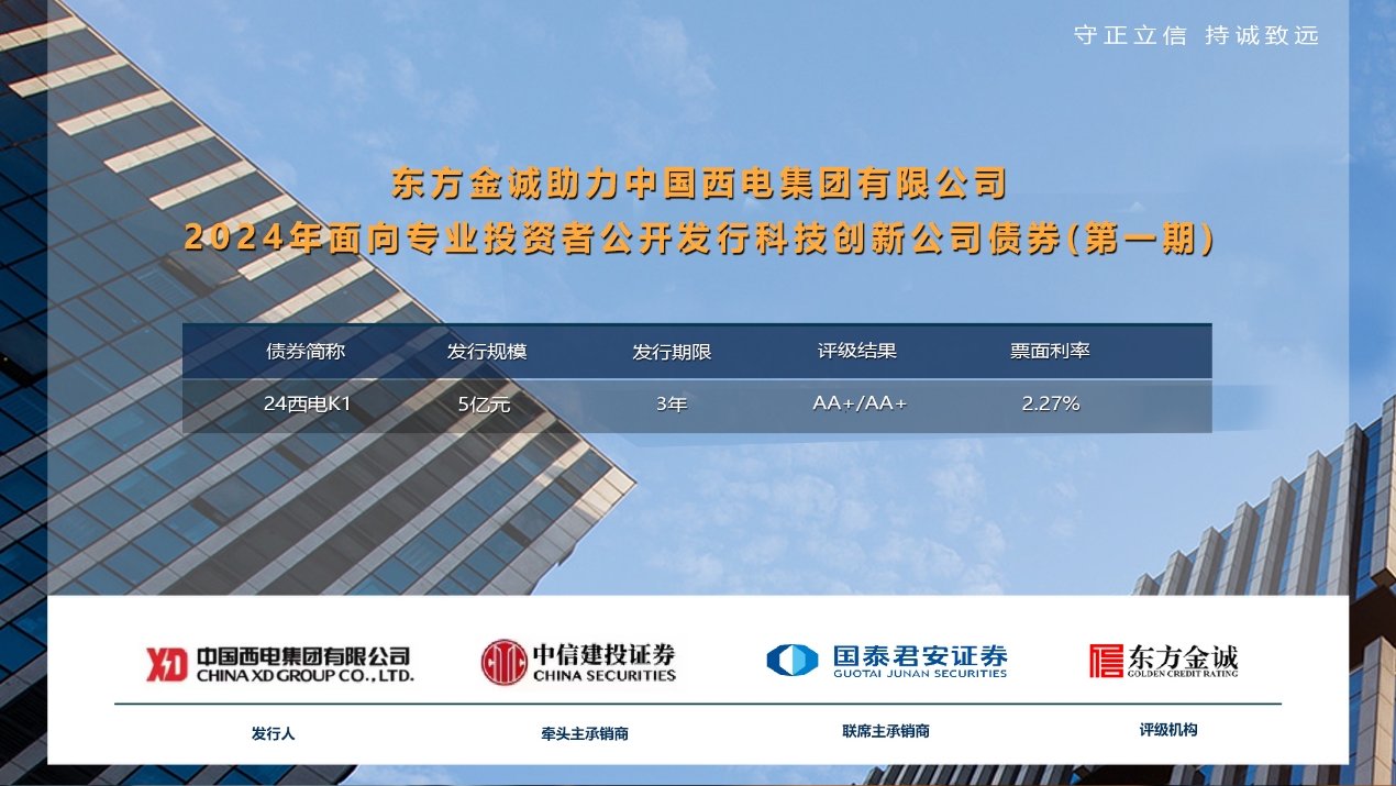 近日,东方金诚评级的“中国西电集团有限公司2024年面向专业投资者公开发行科技创新公司债券(第一期)”(以下简称“本期债券”)在上交所成功发行。本期票据发行规模为5亿元,期限为3年,发行利率为2.27%,创同评级同期限央企债券票面利率历史新低、创同评级同期限科创债券票面利率历史新低。