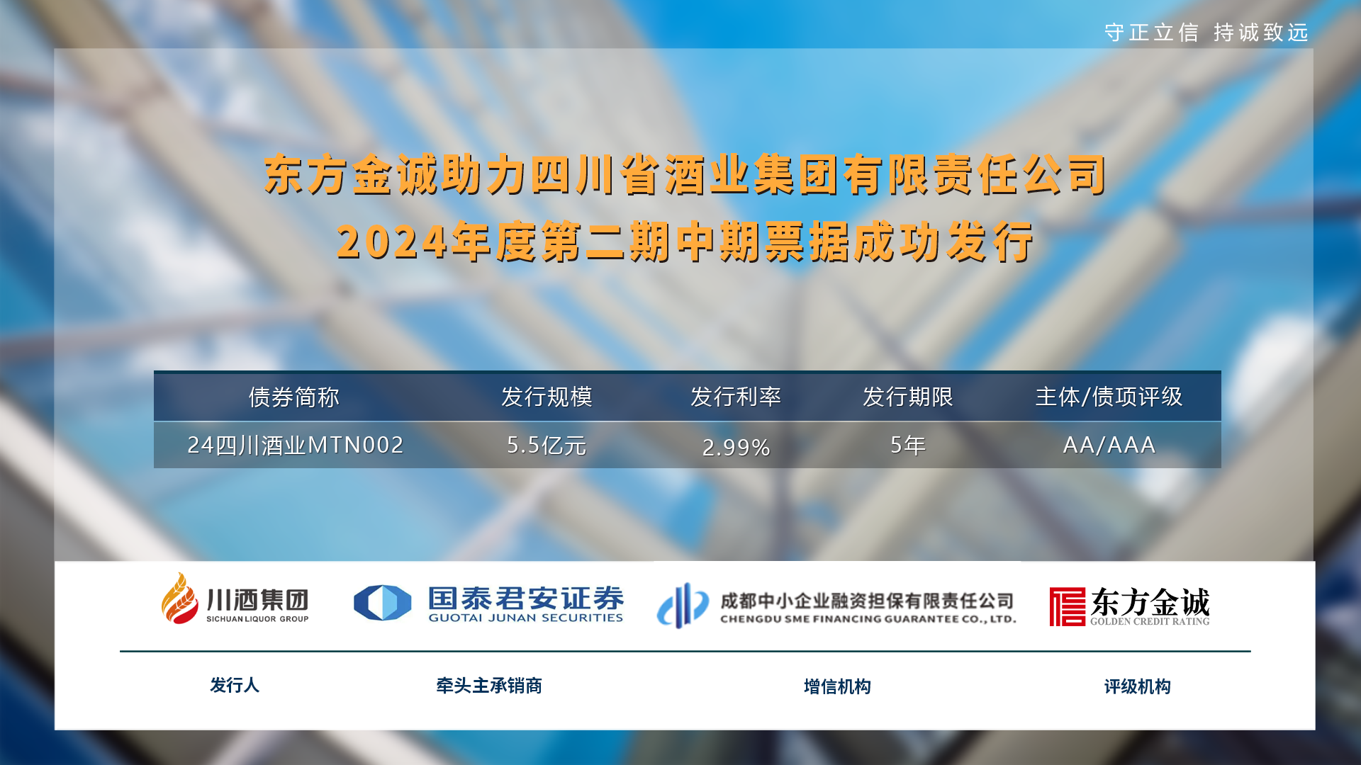 近日,由东方金诚评级的“四川省酒业集团有限责任公司2024年度第二期中期票据”(以下简称“本期票据”)在银行间债券市场成功发行。本期票据发行规模5.5亿元,发行期限5年,发行利率2.99%。