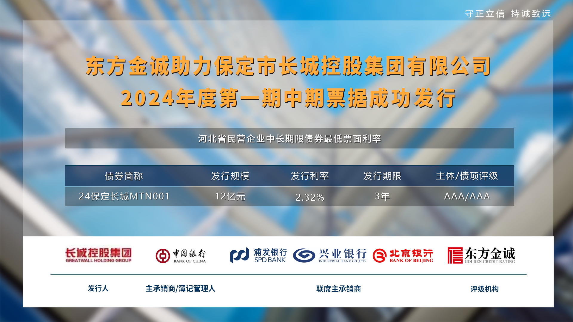 近日,由东方金诚评级的“保定市长城控股集团有限公司2024年度第一期中期票据”(以下简称“本期票据”)在银行间债券市场成功发行。本期票据发行规模12亿元,发行期限3年,发行利率2.32%,创河北省民营企业中长期限债券票面利率最低。