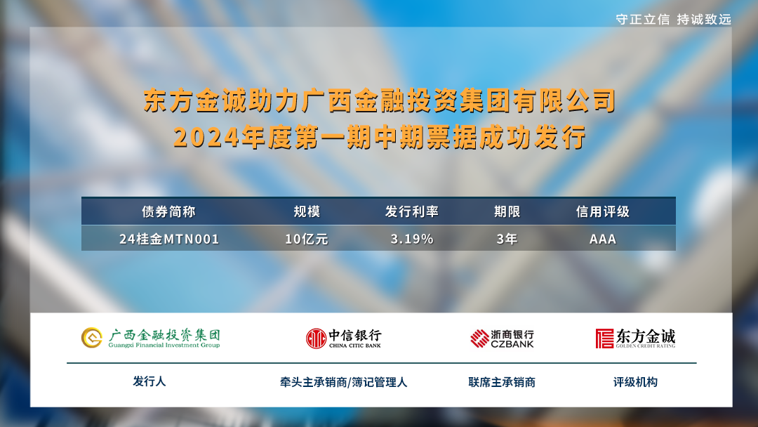 近日,东方金诚助力“广西金融投资集团有限公司2024年度第一期中期票据”(以下简称“本期票据”)在银行间债券市场成功发行。本期债券发行规模10.00亿元,发行期限3年,发行利率3.19%。