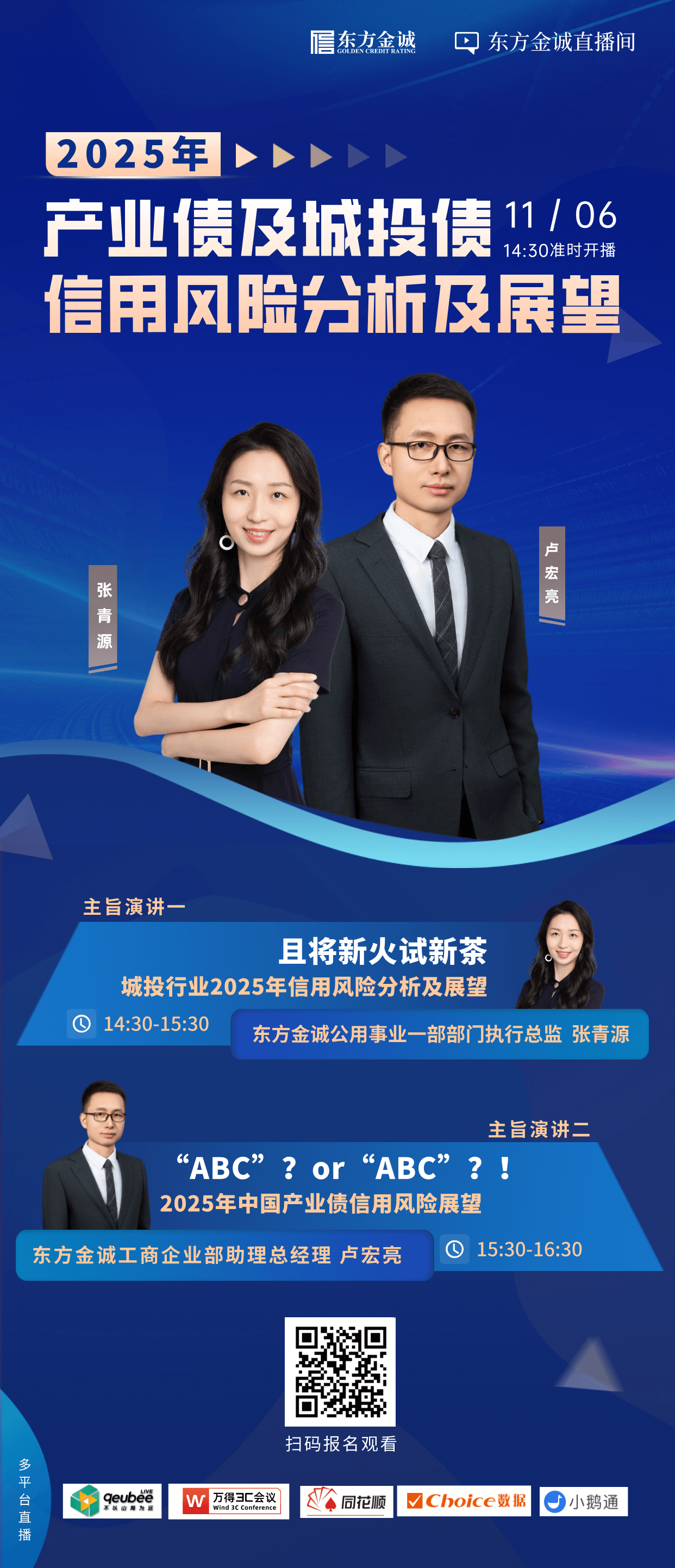 为了更好地发挥金诚研究“三个服务”的作用,进一步强化与社会各界的学习、研讨和交流,东方金诚于2024年11月06日(周三)15:00,组织“2025年产业债及城投债信用风险分析及展望”线上交流会,分享对相关领域的研究和思考。