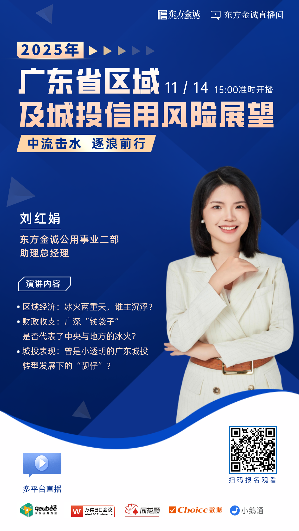 为了更好地发挥金诚研究“三个服务”的作用,进一步强化与社会各界的学习、研讨和交流,东方金诚于2024年11月14日,组织“中流击水,逐浪前行——2025年广东省区域及城投信用风险展望”线上交流会,分享对相关领域的研究和思考。