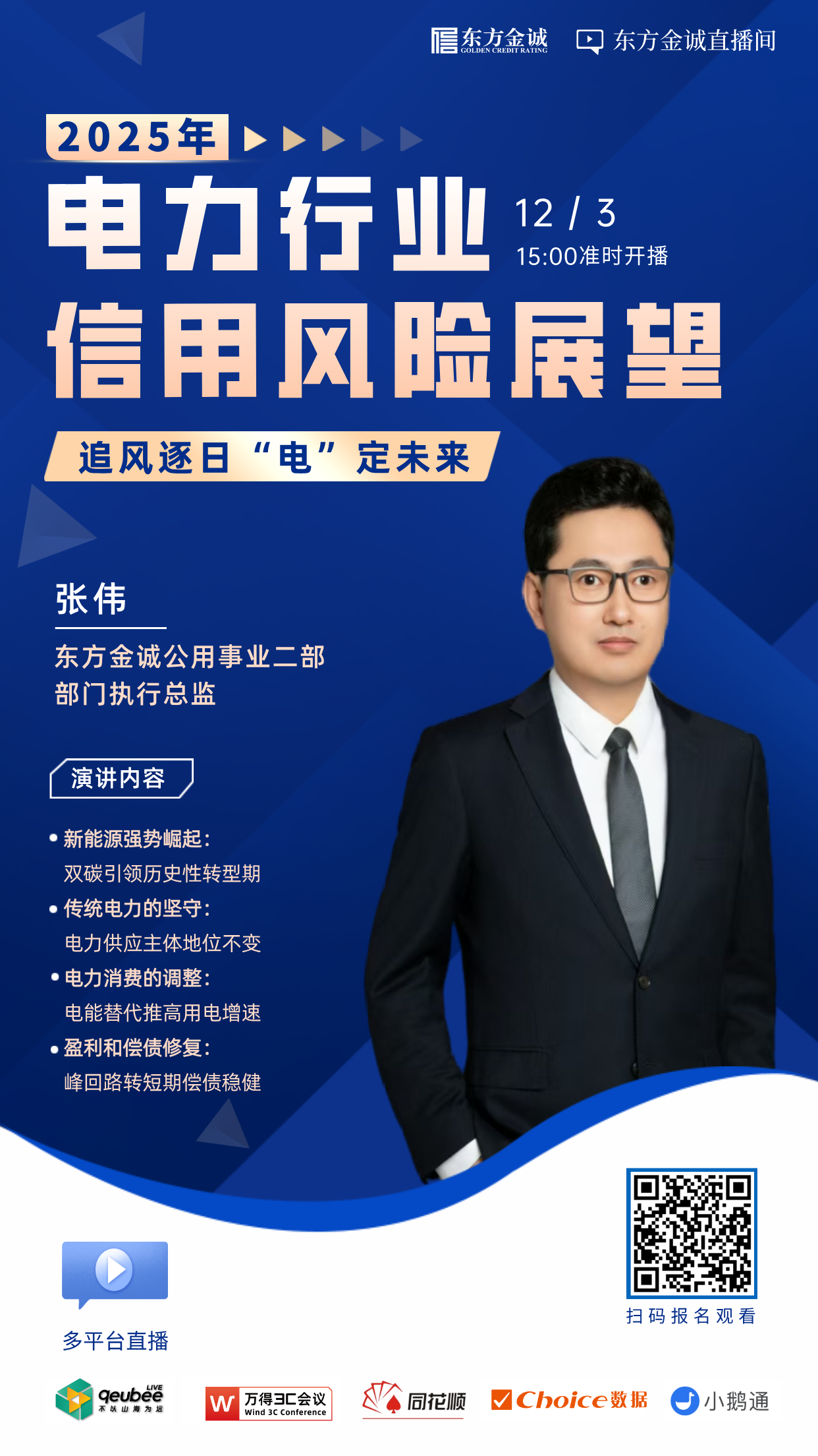 双碳目标提出后,电力行业引来历史性转型期,近两年新能源发电的高增速能否延续?电力消费端呈现出那些特点?煤电电价政策调整及新能源加速入市,对电力企业又有多深影响?东方金诚于2024年12月3日(周二)组织“追风逐日 ‘电’定未来——2025年电力行业信用风险展望”线上交流会,分享对相关领域的研究和思考。