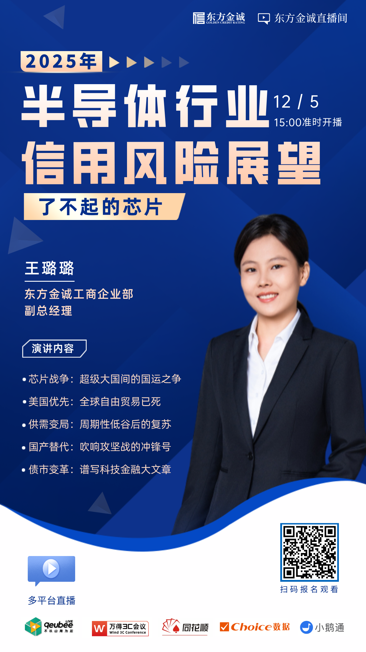 美国大选结果新鲜出炉,特朗普2.0开启,半导体政策环境将如何演变?芯片战争开打以来,中国科技企业奋力追赶,国产替代进展几何?半导体需求回暖,但竞争烈度不减,百舸争流谁能笑到最后?东方金诚于2024年12月5日组织“了不起的芯片——2025年半导体行业信用风险展望”线上交流会,分享对相关领域的研究和思考。