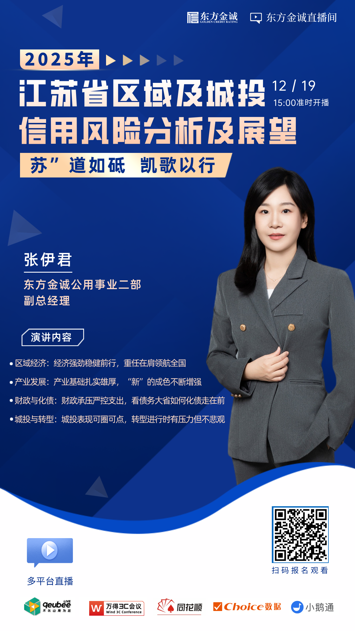 为了更好地发挥金诚研究“三个服务”的作用,进一步强化与社会各界的学习、研讨和交流,东方金诚于2024年12月19日组织““苏”道如砥 凯歌以行——2025年江苏省区域及城投信用风险分析及展望”线上交流会,分享对相关领域的研究和思考。