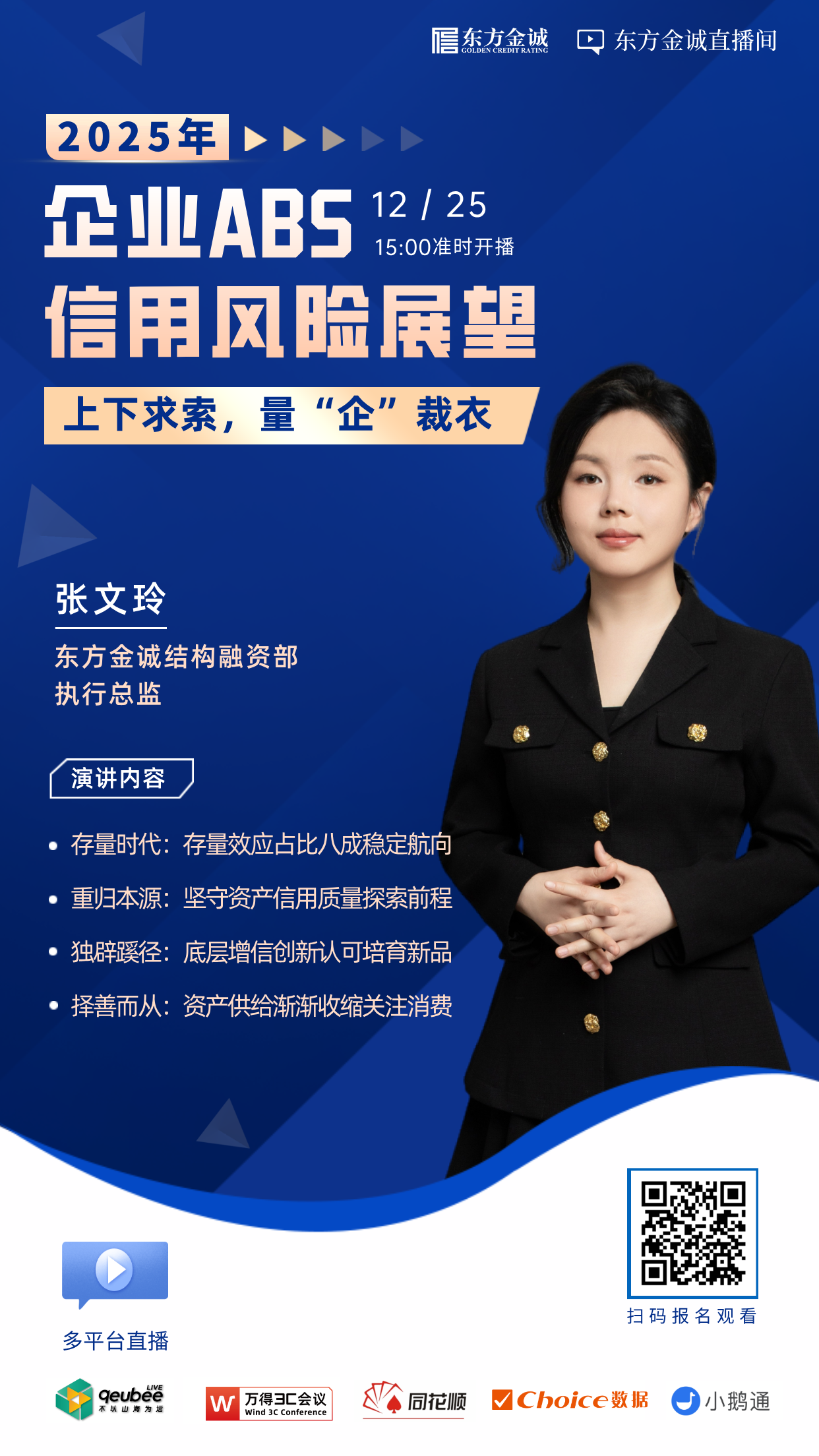 为了更好地发挥金诚研究“三个服务”的作用,进一步强化与社会各界的学习、研讨和交流,东方金诚于2024年12月25日组织“上下求索 量‘企’裁衣——2025年企业ABS信用风险展望”线上交流会,分享对相关领域的研究和思考。