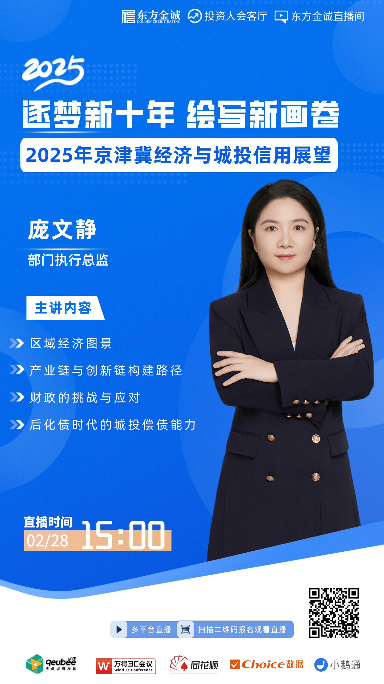 为了更好地发挥金诚研究“三个服务”的作用,进一步强化与社会各界的学习、研讨和交流,东方金诚于2025年2月28日组织“逐梦新十年 绘写新画卷——2025年京津冀经济与城投信用展望”线上交流会,与您一起思考京津冀区域经济发展现状、原因及未来破局思路,分析京津冀区域财政与债务压力、化债举措及成效,解析京津冀城投债市表现与偿债风险。