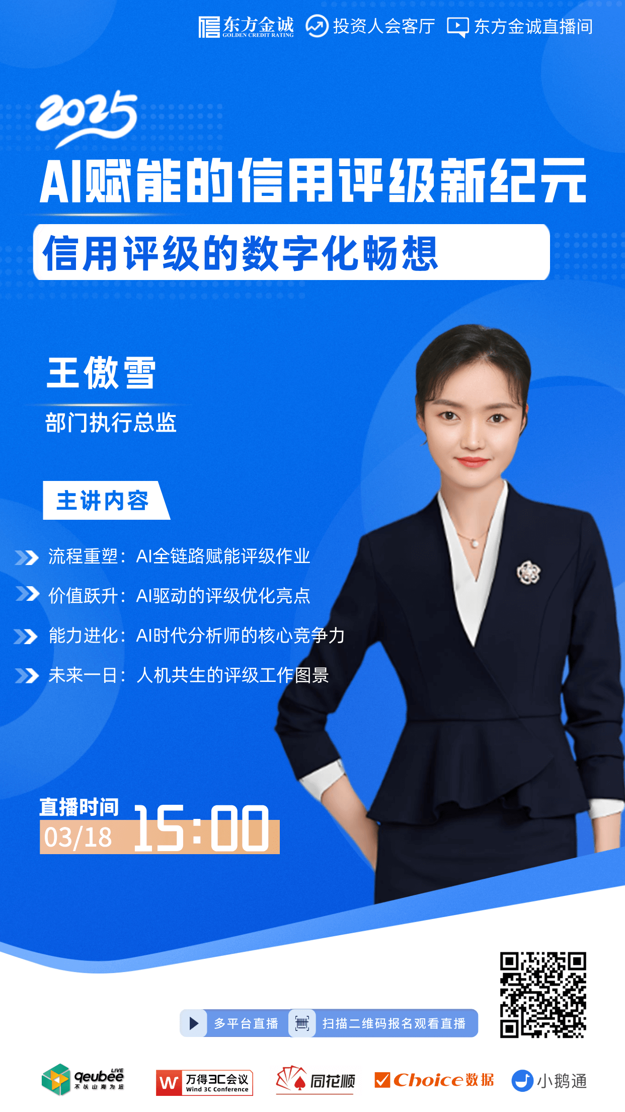 为了进一步强化与社会各界的学习、研讨和交流,东方金诚于2025年3月18日组织“AI赋能的信用评级新纪元——信用评级的数字化畅想”线上交流会,与您一起从AI通过流程重塑实现对评级的全链路赋能、AI驱动的评级优化亮点、AI时代分析师的核心竞争力和未来图景四个维度,对信用评级的未来进行探索。