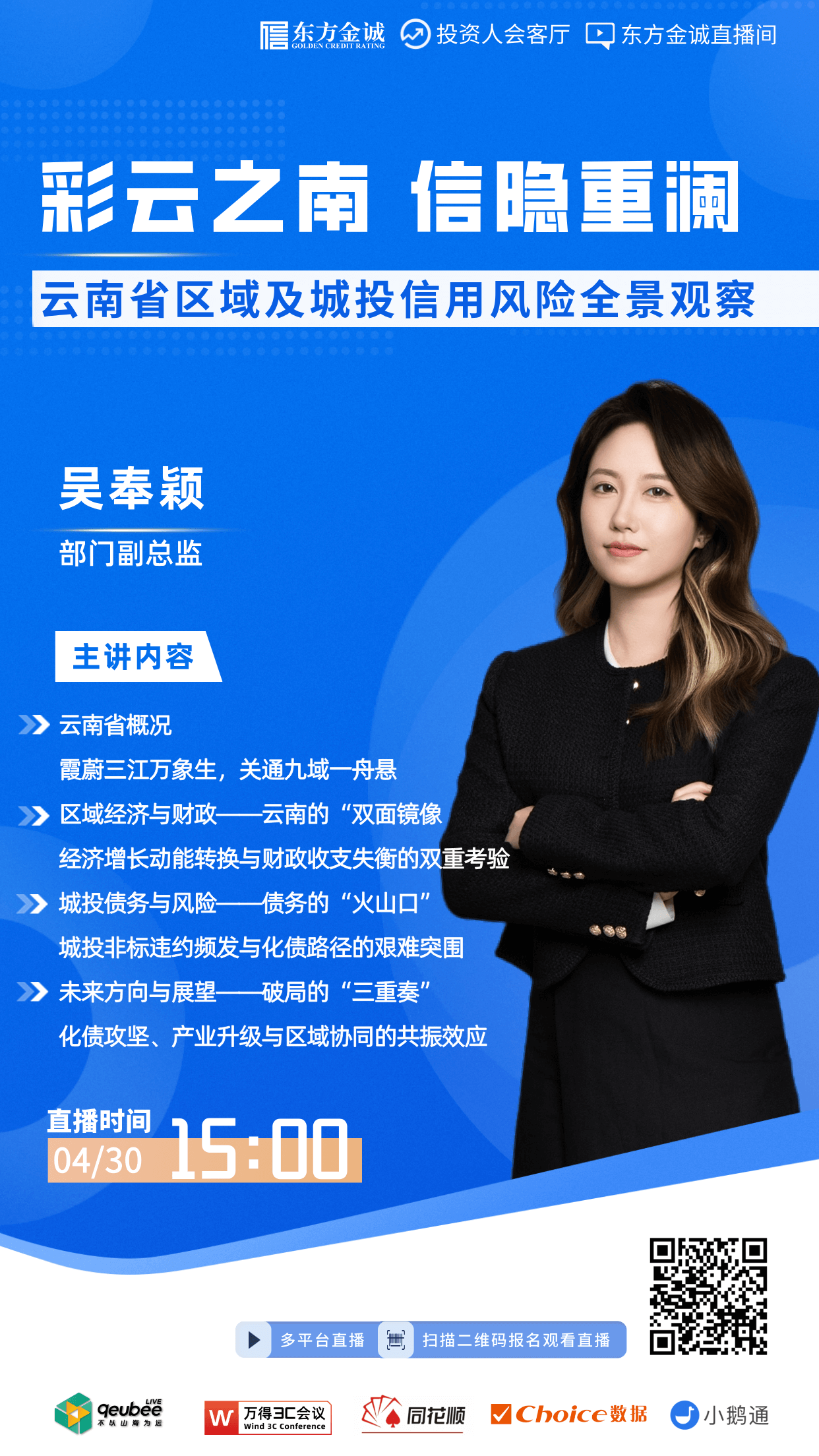 为了更好地发挥金诚研究“三个服务”的作用,进一步强化与社会各界的学习、研讨和交流,东方金诚于2025年4月30日组织“彩云之南 信隐重澜——云南省区域及城投信用风险全景观察”线上交流会。本次交流会将从区域经济、债务风险、产业转型等多维度切入,结合详实数据与典型案例,深度剖析云南城投债务的形成逻辑、风险特征及化解策略,为行业内外提供前瞻性思考与实践参考。让我们共同探讨:在这场化债攻坚战中,云南如何实现突围?又将如何通过产业升级与区域协同书写高质量发展新篇章?
