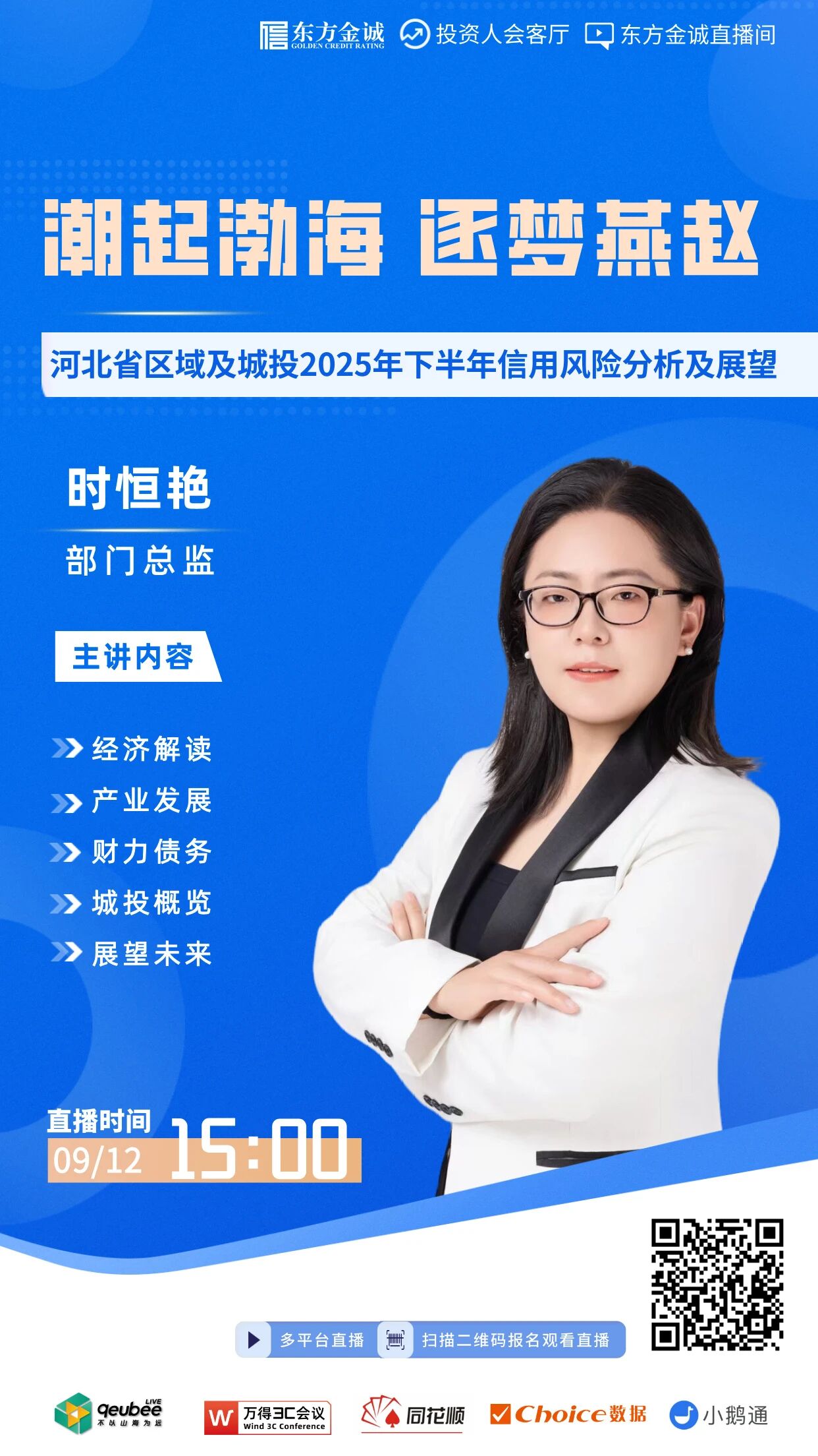 为了更好地发挥金诚研究“三个服务”的作用,进一步强化与社会各界的学习、研讨和交流,东方金诚组织“潮起渤海,逐梦燕赵——河北省区域及城投2025年下半年信用风险分析及展望”线上交流会。本次交流会主要内容包括: