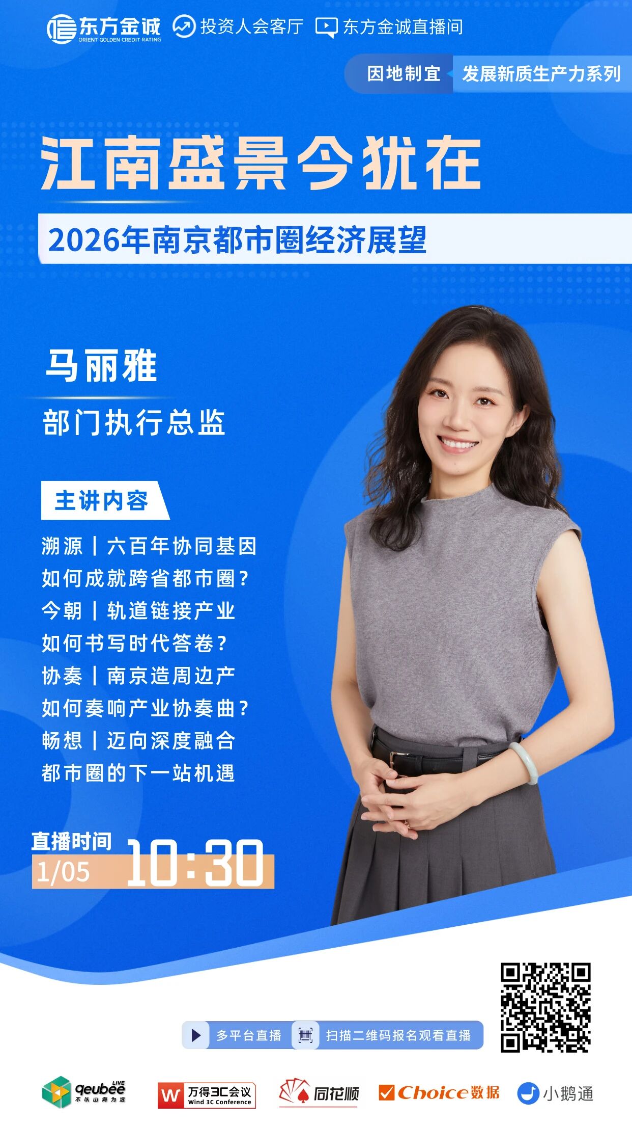 为了更好地发挥金诚研究“三个服务”的作用,进一步强化与社会各界的学习、研讨和交流,东方金诚计划于2026年1月5日(周一)10:30,组织“江南盛景今犹在——2026年南京都市圈经济展望”线上交流会,与您一起洞察中国区域协同发展的未来路径。