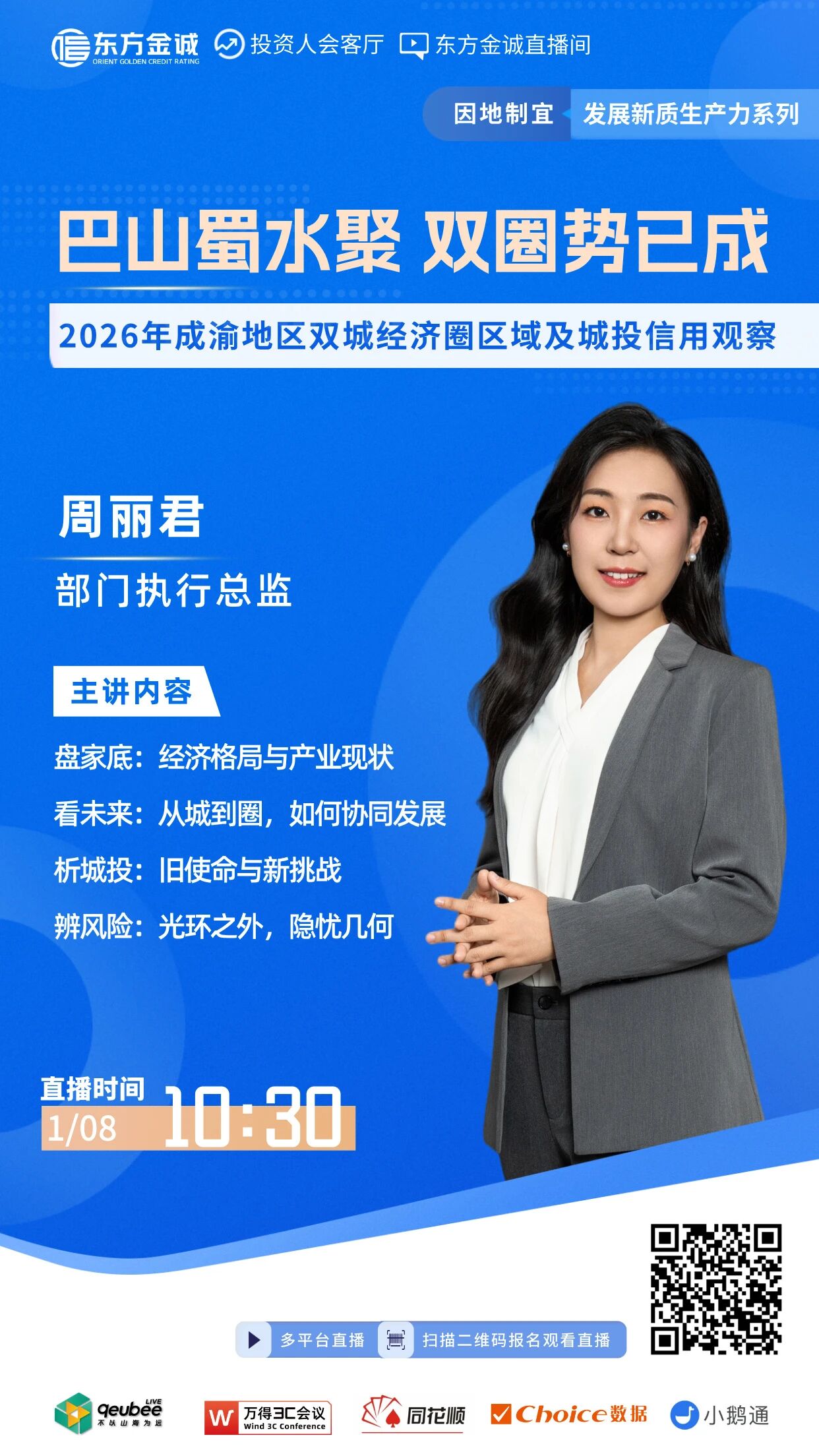 为了更好地发挥金诚研究“三个服务”的作用,进一步强化与社会各界的学习、研讨和交流,东方金诚计划于2026年1月8日(周四)10:30,组织“巴山蜀水聚,双圈势已成——2026年成渝地区双城经济圈区域及城投信用观察”线上交流会,与您一起聚焦成渝双圈动态演进,解析城投信用脉络。