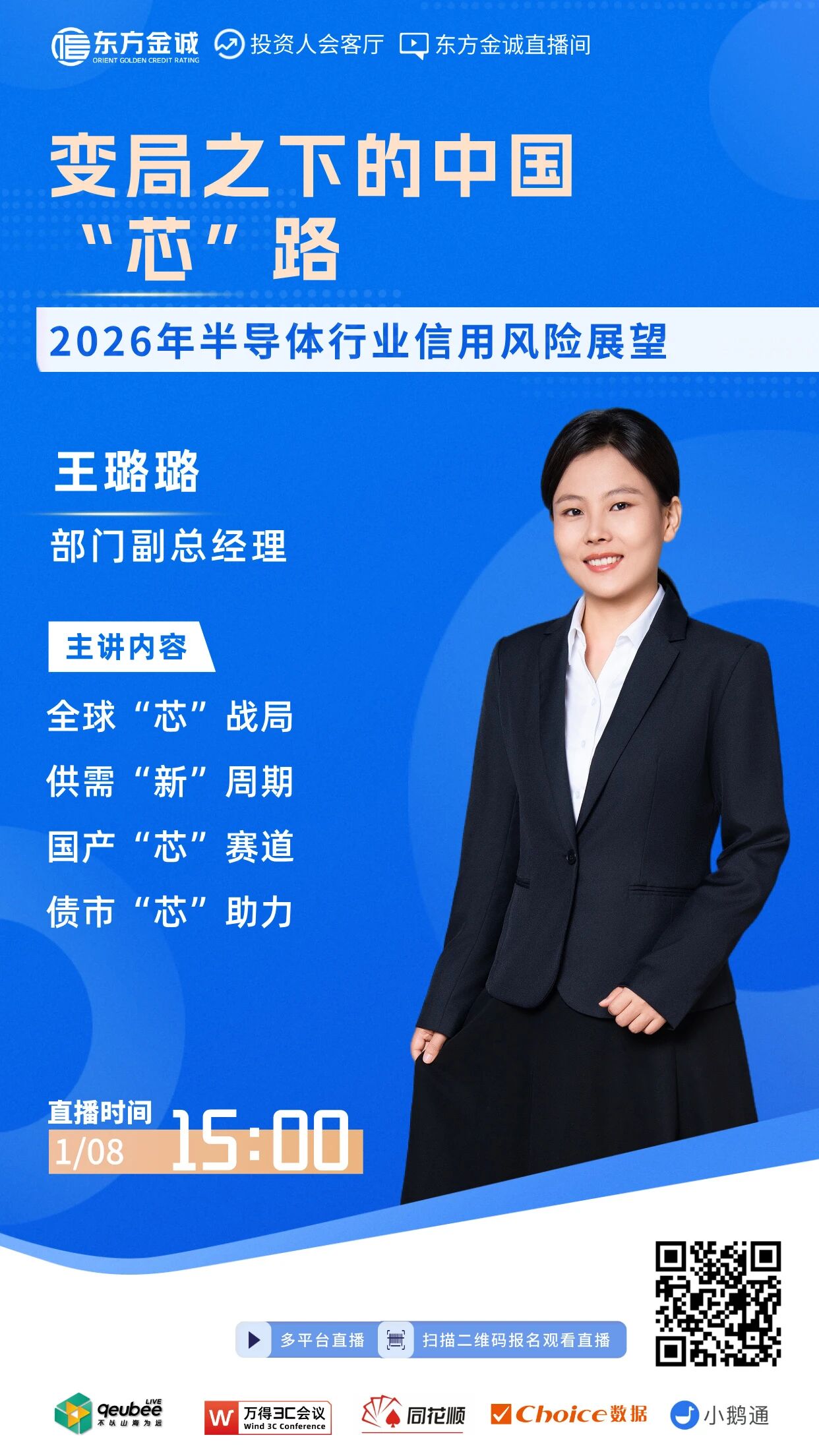 为了更好地发挥金诚研究“三个服务”的作用,进一步强化与社会各界的学习、研讨和交流,东方金诚计划于2026年1月8日(周四)15:00,组织“变局之下的中国‘芯’路——2026年半导体行业信用风险展望”线上交流会,分享我们对相关领域的研究和思考。