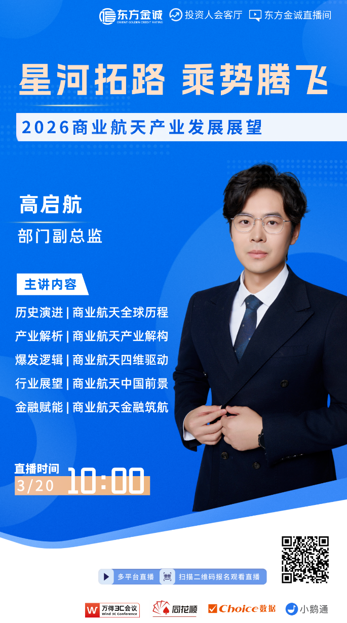 为了更好地发挥金诚研究“三个服务”的作用,进一步强化与社会各界的学习、研讨和交流,东方金诚计划于2026年3月20日(周五)10:00,组织“星河拓路,乘势腾飞——2026商业航天产业发展展望”线上交流会,分享我们关于相关领域的思考和研究。