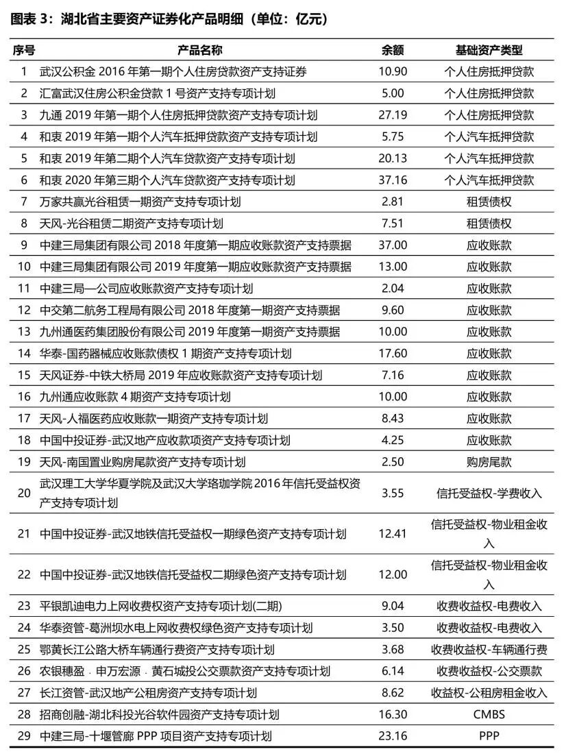 湖北省的存量资产证券化产品规模较小,参与主体以信用实力较强的国有企业为主。据WIND统计,截至2019年末,疫情重灾区湖北省ABS存量规模为336.43亿元,涉及29单项目126只债券,占比为0.97%,发行单数较少,规模占比较低。基础资产类型主要涉及个人住房抵押贷款、个人汽车抵押贷款、租赁债权和应收账款等债权类,以及收费收益权、物业租金收入等收益权类。按照企业性质划分,存续产品中,原始权益人、增信方以综合实力较强的国有企业为主,信用水平较高,受疫情冲击程度较小;民营企业仅涉及九州通医药集团、人福医药、凯迪电力等企业,受冲击程度不一。