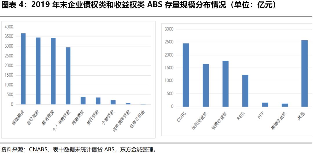根据WIND统计,截至2019年末,我国已发行ABS产品中,信贷ABS存量规模约为1.4万亿元,企业ABS和ABN存量规模约2万亿元。企业类产品中,基础资产为债权类的规模达1.3万亿元,以保理融资、应收账款、融资租赁、个人消费贷款等资产为主;基础资产为收益权类的规模约0.7万亿元,以CMBS、信托受益权、收费收益权和REITs等资产类型为主。